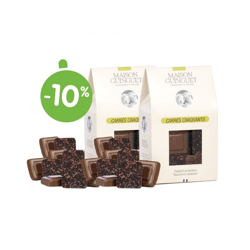 lot de 2 étuis carrés de chocolat noir et lait fourré d' un praliné noisettes, biscuit et caramel finement recouvert d'une poudre de framboise 100g