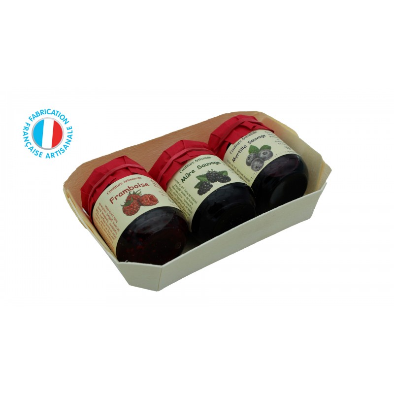 coffret de 3 confitures de nos montagnes 345g framboises, mûre sauvage, myrtille sauvage.