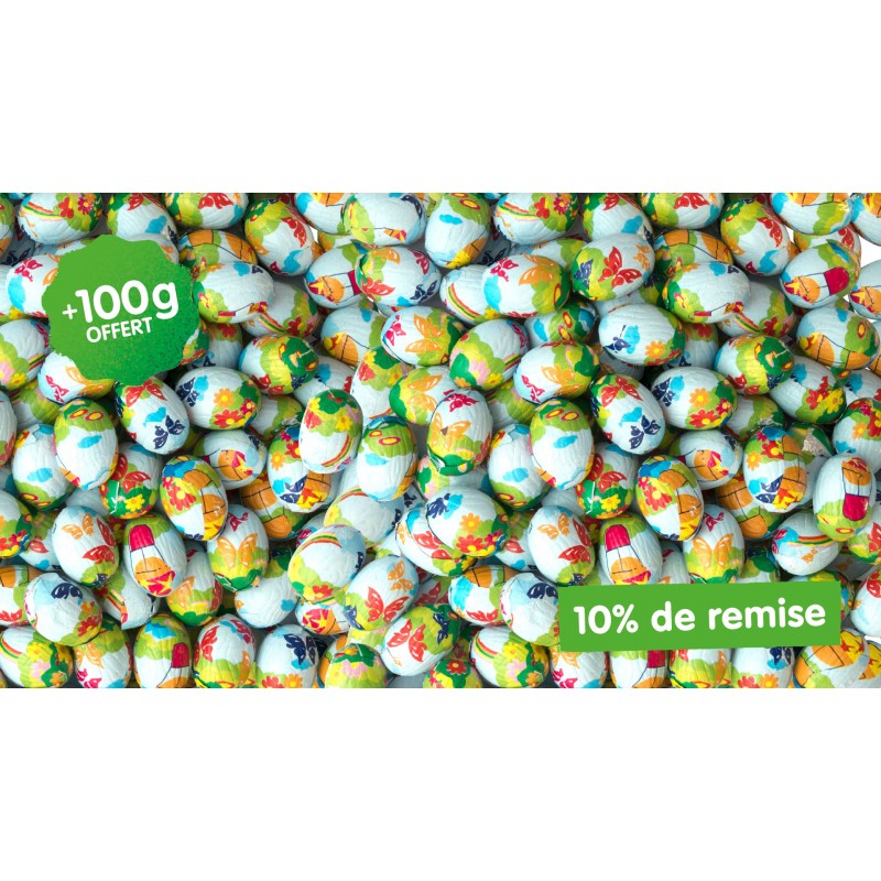 900gr d'oeufs lait crème noisette céréales sous alu, 100 gr offert soit 1 kg et l'équivalent de 10% de remise