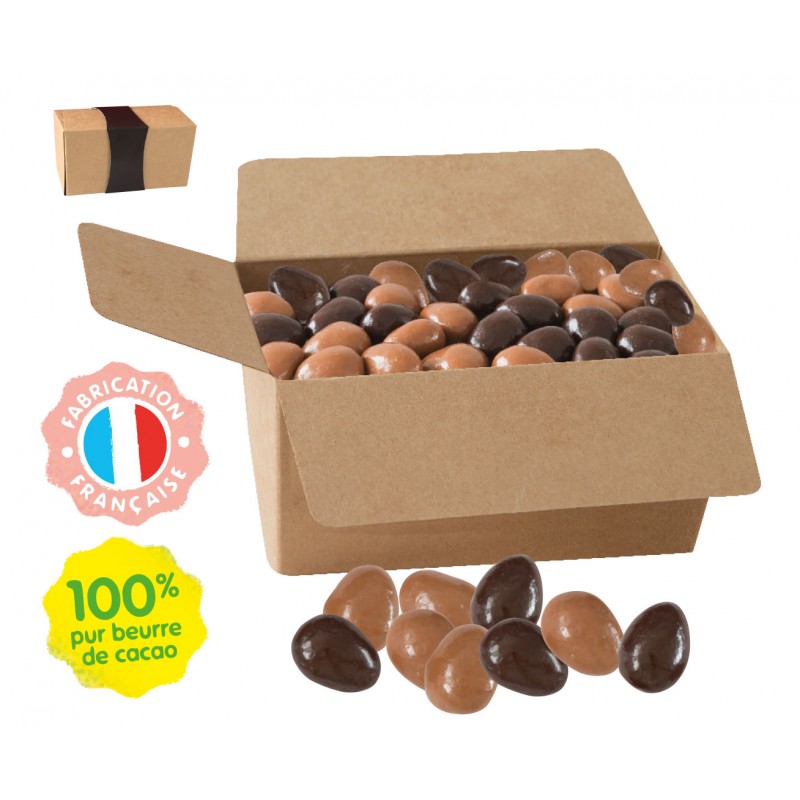 Nougatine enrobée soit de chocolat lait 34% de cacao soit chocolat noir 60% de cacao