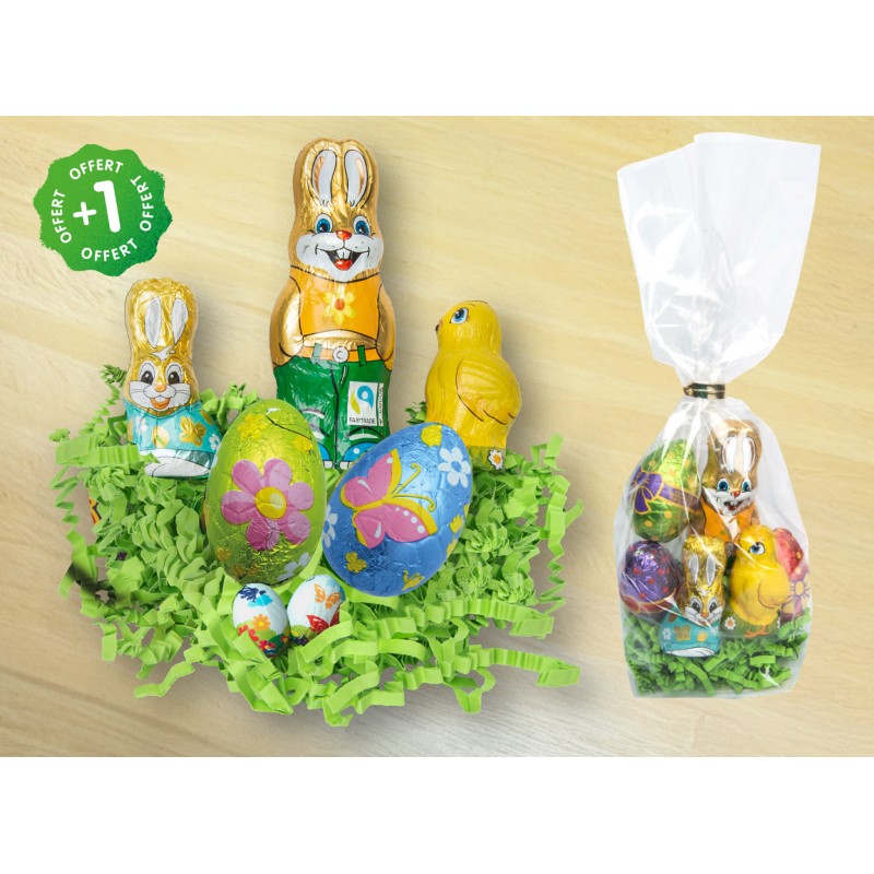 sachet de 2 oeufs 10g, 2 oeufs 12.5g, 1 poussin 12.5g, 1 lapin 12.5g, 1 lapin 25g x6 (5+1 offert)