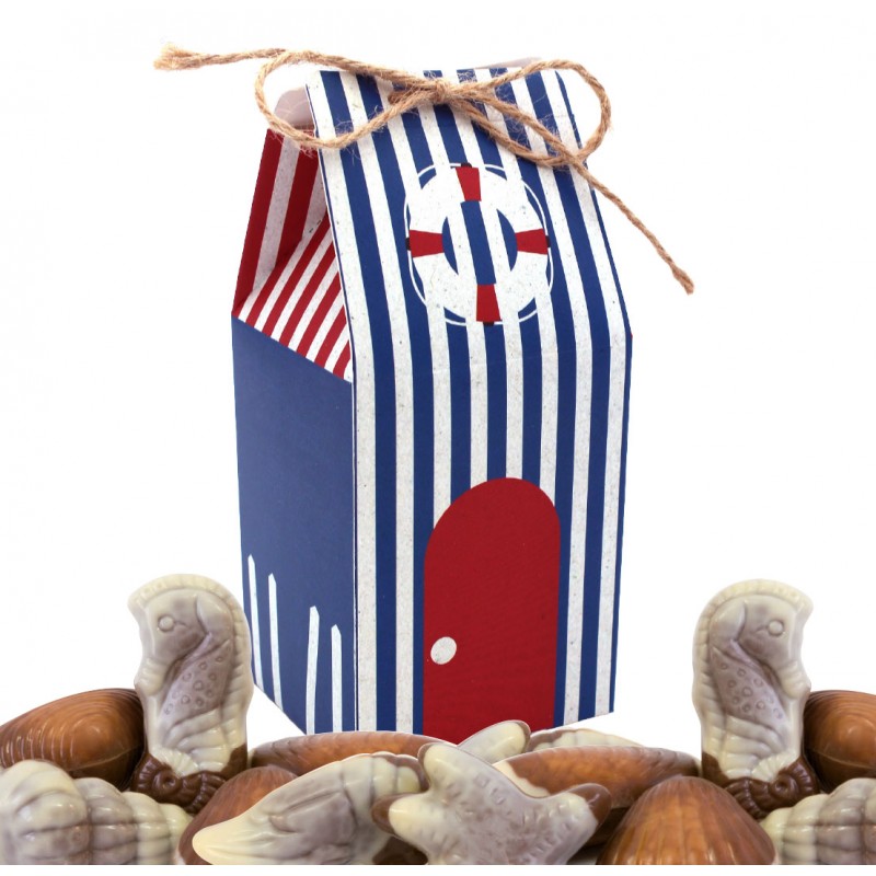 Cabine de plage garnie de fruits de mer en chocolat au lait marbré fourré praliné 300gr.